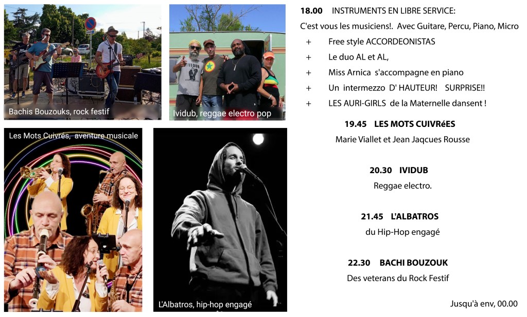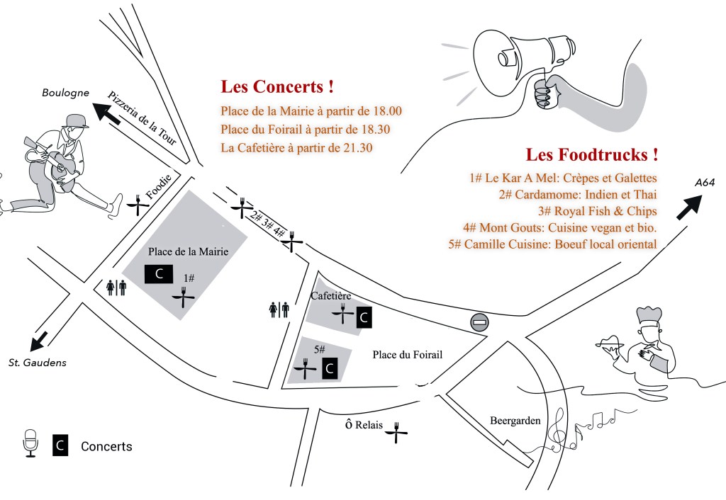Il y aura à manger aux 4 foodtrucks , au Foodie, à Pizzeria de la Tour, à La Cafetière, O’Relais.